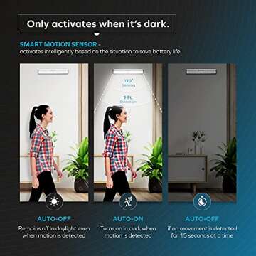 QualityWatt LED Motion Sensor Light Indoor [3-Pack] – Battery LED Lights – Motion Sensor Closet Lights, Under Cabinet Lights, Night Light, Wall Light – 10 Bulbs Per LED Strip Light