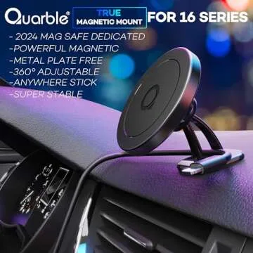 Show moreIntroducing the all-new Quarble Magnetic Car Phone Mount, engineered to revolutionize your driving experience. With compatibility designed explicitly for iPhone models 12, 13, 14, 15, and 16, this innovative mount eliminates the need for additional metal plates, allowing for effortless and secure attachment. Utilizing Quarble Lab’s advanced 2024 Super Magnet, it boasts a holding power unmatched on the market, reaching twice the strength of typical mounts and a staggering 50 times stronger than older versions, ensuring your device stays firmly in place through every bump on the road.