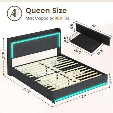 Queen Bed Frame with RGB LED Lights Headboard & USB-C/A Charging Station, Modern Upholstered Platform Bed with Storage Drawers, Heavy Duty Steel Slats, No Box Spring Needed, Dark Gray