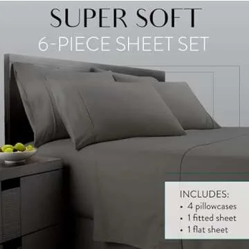 Queen Sheet Set 6 Piece Hotel Quality Bed Sheet w/ 4 Pillowcases - Microfiber Sheet Sets with Deep Pockets, Breathable Cooling Wrinkle Free, Machine Washable 6 Pc Sheets for Queen Size Bed, Gray