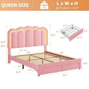 Queen Upholstered LED Bed Frame with 2 Storage Drawers and Adjustable Chic Double Wavy Headboard, Velvet Princess Platform Bed with Charing Station, Solid Wood Slats Support,No Box Spring Needed, Pink