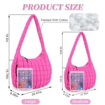 Show more Introducing the ultimate fashion accessory for every modern woman: the Large Puffer Tote Bag! This stylish and versatile quilted tote bag is designed for those who appreciate both functionality and fashion. With dimensions of M:17.7*12.2*4.7 inches and L:20.47*8.26*15.74 inches, this large capacity bag has ample space for all your daily essentials including your laptop, cosmetics, water bottle, and even an umbrella, all while maintaining a light and streamlined appearance.
