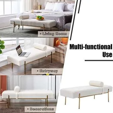Show moreIntroducing the QUINJAY Modern End of Bed Bench, the perfect fusion of elegance and comfort that elevates your living space. Crafted with care, this stunning bench features a luxurious white faux fur upper seat cushion, offering unparalleled softness and support for relaxation. Complementing the cushion, the sturdy gold metal frame not only provides robust stability but also adds a chic, modern touch to your décor. Its thoughtful construction ensures that this piece is more than just furniture; it's an accent that transforms any room into a lavish oasis.