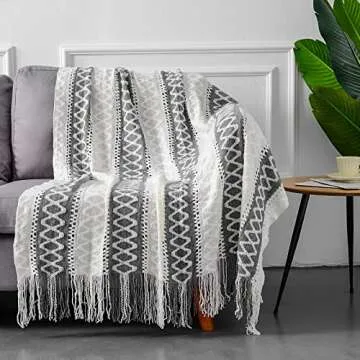 Quinnsus Knit Soft Lightweight Decorative Bed Throw Blankets, Jacquard Textured Boho Summer Throw Blanket with Tassels for Bed, Sofa and Living Room (Grey, 50 x 60 inches)