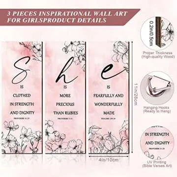 Show more Transform any space into a haven of inspiration with our stunning set of three motivational wall decor pieces. Carefully crafted for women, these unique decor items feature a beautiful blend of inspirational Bible quotes and floral patterns, designed to uplift your spirits and brighten your day. Each piece measures a perfect size of 30 x 10 x 0.5 cm, making them ideal for hanging in your home, office, or even dorm room.