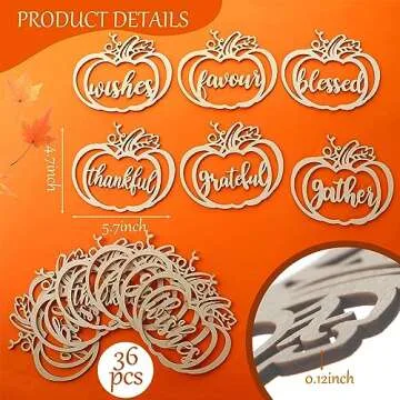 Show moreTransform your Thanksgiving gatherings into a warm, inviting atmosphere with the Qunclay 36 Pcs Thanksgiving Plate Decor Pumpkin Wood Cutouts. Crafted with care and attention, these beautiful autumn decorations feature a collection of 36 unique wooden pumpkin cutouts, each gracefully designed to express gratitude and enhance your festive table scape. At a convenient size of 5.9 x 4.7 inches, they strike the perfect balance—not too big to overwhelm your table, yet large enough to make a statement. The exquisite craftsmanship and quality materials combined ensure these decorations provide lasting beauty for multiple seasons of delight.