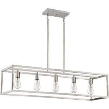 Show moreIlluminate your home with the stunning Quoizel New Harbor Linear Chandelier, a perfect blend of modern elegance and nostalgic charm. Measuring an impressive 38 inches and featuring a five-light design, this pendant light transforms any space into a warm and inviting atmosphere. The open-frame silhouette optimally distributes light, creating a bright and airy feel ideal for contemporary living. Its brushed nickel finish not only offers durability but also complements a myriad of interior styles—from modern farmhouse to industrial chic—making it a versatile choice for every home.