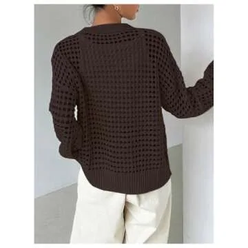 QWINEE Women's Cardigan Sweater Crochet Hollow Out Cardigan Long Sleeve Collar Neck Lightweight Sweater Button Front Knit Top Chocolate Brown Medium