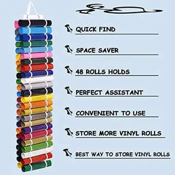 Show more Introducing the QXSMAHP Vinyl Storage Organizer, a premium vinyl roll holder designed to bring efficiency and elegance to your crafting space. Crafted with high-quality Oxford fabric and durable PVC material, this hanging organizer is not only aesthetically pleasing but also built to last. With the capability to hold up to 48 rolls of vinyl, each with a diameter of less than 2.4 inches, this organizer solves the eternal struggle of vinyl chaos and mess. Its transparent compartments allow you to quickly identify and retrieve your desired materials, transforming your crafting experience into a seamless and enjoyable journey.