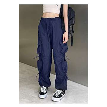 QYANGG Baggy Parachute Pants for Women& Girls Drawstring Elastic Low Waist Ruched Cargo Pants Multiple Pockets Jogger Y2K Navy