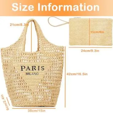 Show moreIf you’re on the hunt for a stylish yet functional accessory this summer, look no further than the QZUnique Women Straw Woven Bag. This charming handbag, with dimensions of 15 * 6.5 * 3 inches, is the perfect companion for any sunny day adventure. Accompanied by a matching wristlet (9.3 * 8 inches), it makes organizing personal items such as bank cards, keys, and phones worry-free. The secure zipper opening ensures that your valuables are safe and sound, while the generous interior space means you can easily carry all your beach essentials—umbrellas, slippers, sunscreen, sunglasses, and more! Made from high-quality, lightweight, and durable materials, this crochet beach bag is designed for easy folding and portability, making it an ideal accessory for women on the go.