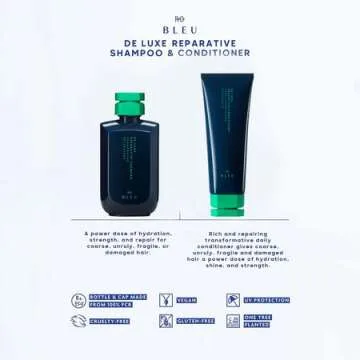 Show more Introducing the R+Co BLEU De Luxe Reparative Shampoo & Conditioner Set, a luxurious duo designed to provide an unparalleled hydration experience for coarse and damaged hair. This dynamic shampoo and conditioner combination offers a power dose of hydration, strength, and essential repair for distressed strands. Formulated for hair that needs a restorative touch, this set promises to gently cleanse and renovate your locks while improving overall health and appearance. With the enticing scents and the ease of use, this set elevates your daily hair care routine into a nourishing ritual.