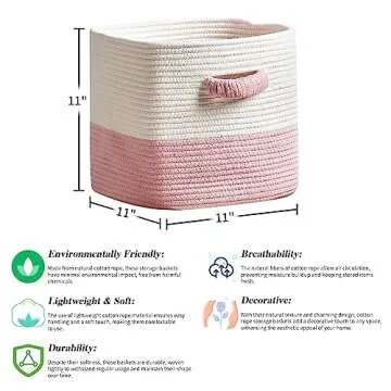 Show moreIntroducing the **R RUNKA Storage Cube Baskets** – the ultimate solution for keeping your living space organized and stylish! Crafted with care, each basket in this set of three measures 11 inches by 11 inches, perfectly designed to fit seamlessly into cube shelving units, closets, or any corner of your home. Made from soft, eco-friendly cotton material, these storage solutions are not only durable but also safe for every family member. Enjoy the beautiful combination of **white and pink** that adds a charming touch to your decor while serving essential storage needs. With reinforced woven cotton rope handles, each basket provides a comfortable grip and strengthens their structure, making them reliable for even heavier loads.