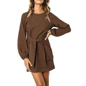 R.Vivimos Women's Autumn Winter Cotton Long Sleeves Elegant Knitted Bodycon Tie Waist Sweater Pencil Dress (Small, Brown)
