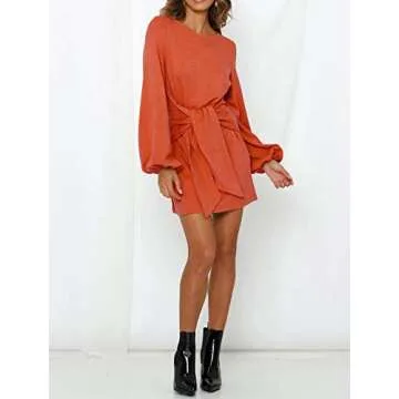 R.Vivimos Women's Autumn Winter Cotton Long Sleeves Elegant Knitted Bodycon Tie Waist Sweater Pencil Dress (Large, Orange)