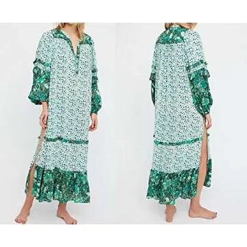 Show moreStep into summer elegance with the R.Vivimos Women's Long Sleeve Floral Print Bohemian Maxi Dress, designed to bring out your inner free spirit. Crafted from a comfortable 65% cotton blend, this dress features stunning lantern sleeves that add a touch of drama, while the delicate ruffles enhance its bohemian charm. The unique button-up front and beautiful boho floral print make it the perfect addition to your seasonal wardrobe. The double slit gives a playful peek of leg, allowing for graceful movement and a breezy feel, ideal for warm days spent outdoors or lounging by the beach.