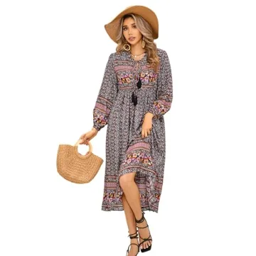 Embrace the bohemian spirit with the R.Vivimos Women's Long Sleeve Floral Print Retro V Neck Tassel Bohemian Midi Dresses. Crafted from a luxurious 60% cotton blend, this dress offers unparalleled softness and comfort, making it a must-have for any fashion-forward wardrobe. The deep V-neck design, accentuated with a front tie at the neckline, adds a touch of elegance and allure, perfect for those who love to stand out. The flowy printed fabric and long sleeves ensure a flattering fit, suitable for a variety...