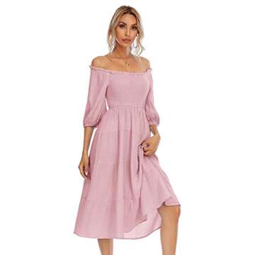 R.Vivimos Women's Summer Cotton Lantern Sleeves Ruffled Off Shoulder A-Line Midi Dresses (Small, Pink)