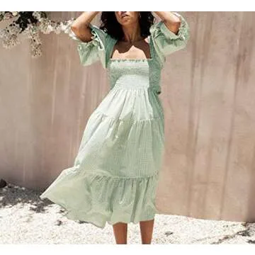 R.Vivimos Women's Summer Cotton Plaid Puff Sleeves Bow Casual Off-Shoulder Boho Midi Dress (Small,Green)