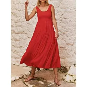 R.Vivimos Women's Summer Sleeveless Tank Dress Boho Casual Smocked Backless Tiered Ruffle Flowy Midi Dress (Medium, Red)