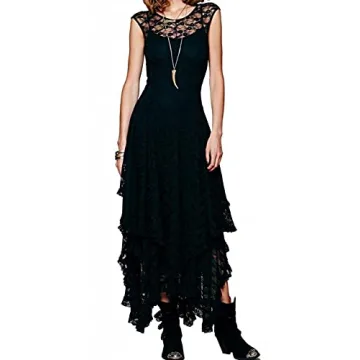 R.Vivimos Womens Sleeveless Backless Asymmetrical Layered Lace Long Dress with Slip Two Pieces (Large, Black)