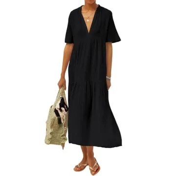 R.Vivimos Womens Summer Cotton Flowy Maxi Dress Short Sleeve V Neck Empire Waist Boho Tiered Ruffle Casual Loose Long Dresses (Large, Black)