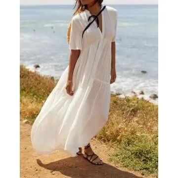 R.Vivimos Womens Summer Cotton Flowy Maxi Dress Short Sleeve V Neck Empire Waist Boho Tiered Ruffle Casual Loose Long Dresses (Medium, White)