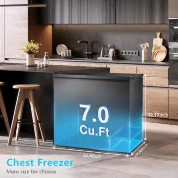 Show more Meet the R.W.FLAME 7.0 Cubic Feet Chest Freezer, the perfect solution for anyone in need of ample, reliable cold storage. Designed with both efficiency and convenience in mind, this large capacity unit measures 33.46” x 21.97” x 32.6”, making it a space-saving addition to your home or office. With a generous 7.0 cubic feet of space, it provides a perfect way to store a variety of items—whether you are saving seafood, ice cream, or meats. The sleek black exterior offers a modern touch to any room while ensuring durability and quality performance.