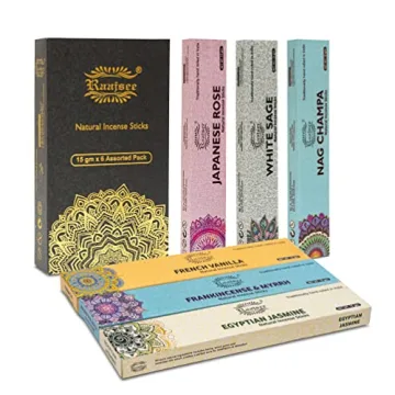 Show more Experience serenity and relaxation like never before with the Raajsee Incense Sticks 6 Pack Variety Set. This meticulously curated collection features six enchanting fragrances: Nag Champa, Egyptian Jasmine, French Vanilla, Japanese Rose, White Sage, and Frankincense. Each package contains 15 grams of natural incense sticks handcrafted from premium resins, herbs, and aromatic oils, ensuring an authentic experience free from toxic chemicals. Enjoy the warm glow of these 8 to 8.5 inch sticks that offer a clean burn lasting approximately 45 minutes, perfectly designed to create a calming ambiance in your home, yoga studio, or during meditation.