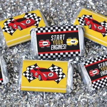 Show moreRev up the excitement at your child’s birthday party with our delightful Race Car Birthday Party Stickers, expertly designed to transform ordinary miniature chocolate candies into vibrant racing-themed treats. Each sticker, measuring 2.5" x 1.5", is crafted with a keen attention to detail, featuring colorful race car illustrations that match the Let’s Go Racing theme perfectly. Designed for easy application, these stickers are perfect for adding a dash of fun to chocolate bars, making your goodie bags stand out at the party!