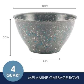 Show more Introducing the ultimate kitchen companion: the Rachael Ray Accessories Kitchen Pantryware Garbage Bowl. This innovative bowl is perfect for collecting food scraps during meal preparation, helping to keep your workspace tidy and efficient. Made from durable melamine, it is designed to withstand the rigors of daily use while adding a stylish touch to your kitchen. The charming sea salt gray color provides a modern aesthetic that can seamlessly integrate into any decor, making it just as appealing as a serving bowl when not in use.