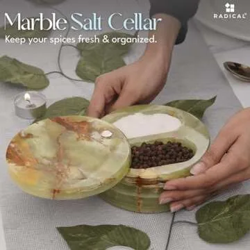 Show more Experience the elegance and functionality of our Dual Compartment Salt Cellar, exquisitely crafted from high-quality natural marble. This stunning kitchen accessory isn't just about aesthetics; its thoughtful design features two spacious compartments with a capacity of 3.38 oz each, allowing you to conveniently store your favorite salts or spices. Measuring 5 inches in diameter and 2.5 inches in height, it's perfectly sized for your kitchen countertop while also being lightweight enough to easily move around your space.