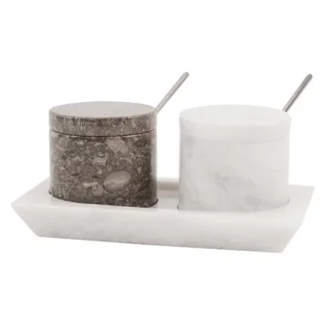 Show more Introducing the luxurious Radicaln Marble Salt Cellar Set, an exquisite blend of functionality and aesthetic appeal designed to elevate your kitchen experience. This elegant set features two beautifully crafted salt cellars, a chic tray, and a matching spoon, making it an essential addition to any culinary space. Each cellar is crafted from premium natural marble, offering both durability and a lightweight quality for everyday use. Measuring at 3 x 3 inches each, and an attractive 8 x 4 inches for the tray, this set not only provides ample room to hold up to 4.5 oz of your favorite spices but also adds a touch of sophistication to your kitchen counter.
