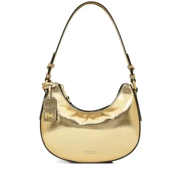 Introducing the RADLEY London Bliss Crescent Shoulder Bag, a stunning blend of nostalgia and modern sophistication, crafted from luxurious metallic leather. This small-sized purse measures 9.6"W x 7.5"H x 2"D, making it the perfect evening companion for any woman who desires both style and functionality. The elegant crescent shape not only offers a chic aesthetic but also provides substantial space for your essentials, ensuring you make a statement wherever you go.