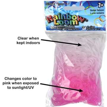 Show moreIntroducing the Rainbow Loom- Color Changing Bands-Solar Moon UV, the ultimate crafting accessory for creative enthusiasts and DIY lovers! This incredible set combines the fun of traditional loom bands with innovative technology that changes the color from clear to a vibrant pink when exposed to sunlight or UV light. Whether you are creating unique bracelets, keychains, or other accessories, these color-changing bands add an exciting twist to your projects. Plus, with a total of 600+ non-latex rubber bands in a variety of sizes and a pack of 24 C-clips, you'll have everything you need to bring your imaginative designs to life!