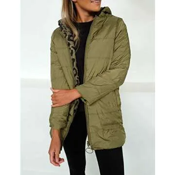 Show moreIntroducing the Rainlin Casual Hooded Zip Jacket, a must-have addition to your fall wardrobe that beautifully balances style and functionality. Featuring a striking cheetah print on one side and a chic forest green on the other, this reversible jacket provides two fashionable looks in one garment. Tailored specifically for women, the design is not only flattering but also built with practicality in mind. Crafted from high-quality materials, it ensures warmth and comfort without sacrificing breathability, making it perfect for transitional weather.