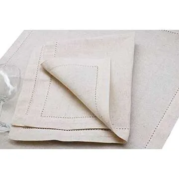Show more Introducing our exquisite set of oversized Linen and Cotton Dinner Napkins, a perfect fusion of elegance and functionality. Made from a unique blend of 12% linen and 88% pure cotton, these napkins are crafted to elevate your dining experience. Each set includes 12 beautifully hemstitched napkins, generously sized at 20 inches x 20 inches, which is a truly luxurious addition as they are 38% larger than standard napkins. The meticulous sewing ensures correctly mitered corners reminiscent of traditional craftsmanship.