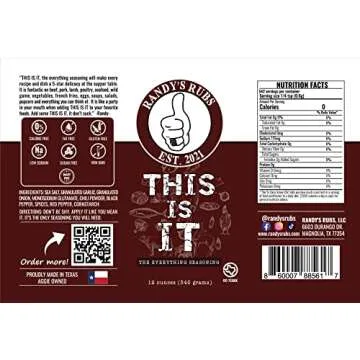 Show moreIntroducing Randy's Rubs Seasoning THIS IS IT – the ultimate flavor enhancer that’s set to revolutionize your cooking experience! Measuring a generous 12 ounces, this large shaker is perfect for any kitchen enthusiast or casual cook alike. Crafted in Texas, each sprinkle of this seasoning bursts with a savory richness that transforms ordinary meals into extraordinary culinary delights. Crafted without gluten, sugar, or dairy, it’s ideal for health-conscious individuals seeking to enjoy robust flavors without the unnecessary additives. With THIS IS IT, you’ll have a versatile seasoning at your fingertips that brings excitement to every dish without compromising your dietary choices!