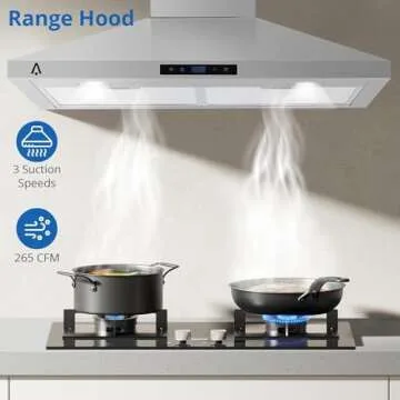 Show more Elevate your kitchen experience with our state-of-the-art 30-inch range hood. Designed for ultimate efficiency and style, this kitchen exhaust hood boasts an impressive 265 CFM fan with three adjustable speeds, ensuring that smoke, steam, and odors are effectively removed from your cooking space. Unlike other hoods, it operates at a maximum noise level of just 62 dB, allowing for a peaceful cooking environment where you can focus on creating delicious meals.