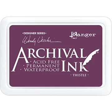Introducing the Ranger Thistle Wendy Vecchi Archival Ink Pad, a must-have for artists, crafters, and anyone who loves to stamp! This archival ink pad is designed to create stunningly crisp and waterproof stamped images that stand out brilliantly on a variety of surfaces. Ideal for mixed media projects or simply adding a personal touch to your letters, this vibrant "Thistle" shade brings a beautiful pop of color to your creations. The **2-3/4 x 4 x 3/4 inch** pad is compact yet provides ample...