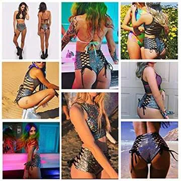 RARITYUS Women Rave Holographic Bodysuit Mini Two Piece Hologram Metallic Silver for Dance Party Clubwear EDM Festival