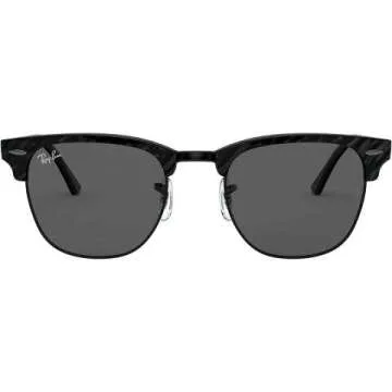 The Ray-Ban Clubmaster sunglasses feature an acetate frame with a sophisticated wrinkled black on black finish, complemented by dark grey lenses. The lenses, made from high-quality crystal, are non-polarized and come with a UV Protection Coating, shielding your eyes from harmful UVA, UVB, and UVC rays. The dimensions of the lenses are specifically designed to offer maximum eye coverage and comfort, making them perfect for various face shapes and sizes.
