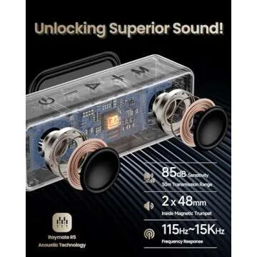Show more The Raymate R5 IPX7 Waterproof Bluetooth HiFi Portable Speaker is a game-changer for music lovers who crave great sound on-the-go. With a 20W dual speaker driver and an advanced audio processing technology, this speaker delivers a rich and balanced sound with zero distortion, making every song a pleasure to listen to. Its integrated structure features a robust design, protected against rain, dust, snow, and splashes. Whether you’re at the pool, beach, or in your bathroom, you can enjoy your favorite tunes without worry.