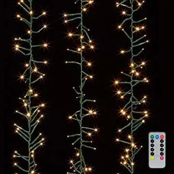 Show more If you're looking to transform your space into a cozy and inviting atmosphere, look no further than the stunning Cluster Garland Lights. This beautifully designed lighting solution features 120 warm white bulbs intricately mounted on a sturdy green wire, blending seamlessly with your decor. With a generous 15-foot lighted length, these lights can accentuate any indoor or outdoor area, whether draped over a garland, wrapped around banisters, or brightening up dark corners.