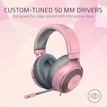 Show more Experience gaming like never before with our top-of-the-line gaming headset from Razer. This headset is engineered for optimal performance with CUSTOM-TUNED 50 MM DRIVERS, delivering a vast soundscape that captures every sound, from the quietest footsteps sneaking up on you to the thunderous clashes of virtual battle. You'll be immersed in your favorite games, feeling every moment as if you were right there in the action.