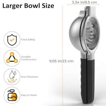 Show more If you're on the hunt for the perfect kitchen companion, look no further than the Max Extraction Lemon and Lime Hand Juicer. This exquisite tool is designed to extract every drop of juice from your favorite citrus fruits, promising a whopping 20% more juice than standard juicers. Made from durable 304 stainless steel, this juicer is not only elegant but also corrosion-resistant, ensuring it will withstand the test of time without reacting with the fruit juices. Say goodbye to health concerns and hello to a juicing experience that prioritizes your well-being.