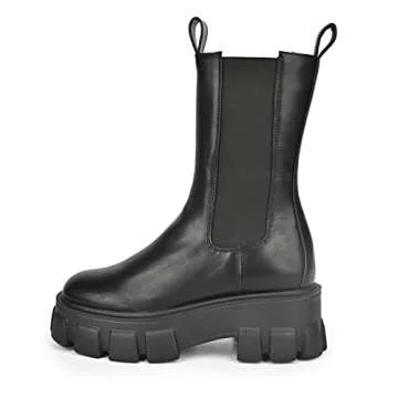 READYSALTED Women's Mid Calf Chunky Sole Platform Chelsea Slip On Fashion Cleated High Ankle Boots(ROTA18-BK,US9)