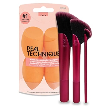 Show more The Real Techniques Rebel Edge Makeup Brush Trio with 4 Miracle Complexion Sponge Blenders is an essential collection designed for a flawless makeup application experience. This high-quality set features expert craftsmanship and innovative designs that empower beauty enthusiasts with the right tools for any look. The inclusion of latex-free foam technology in these sponges ensures an unmatched blend of liquid foundations, granting you a smooth finish that radiates confidence. The versatile Miracle Complexion Sponge allows you to achieve a dewy finish when used damp or full coverage when dry, adapting seamlessly to your makeup routine.
