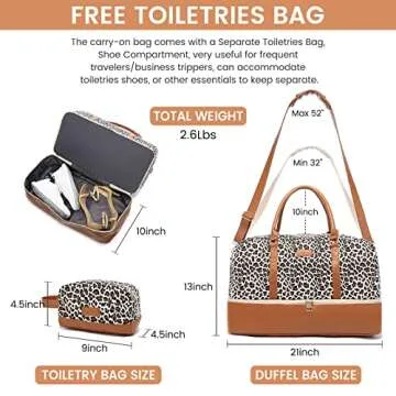 Show moreIntroducing the Realer Weekender Bag for Women – the ultimate solution for your travel needs! This canvas travel duffle bag is not just about style; it offers fantastic functionality with features designed specifically for the modern woman on the go. With a spacious design perfect for weekend getaways, this bag measures 21"L x 13"D x 10"W, providing ample space for 2-4 days of necessities, including clothes, footwear, cosmetics, and more. Dive into convenience with a free separate toiletry bag (valued at $18) that helps to keep your essentials organized and easily accessible. Say goodbye to messy travels – the separate shoe compartment can hold up to two pairs of shoes, or even your dirty clothes, ensuring cleanliness for your favorite outfits while you’re away.