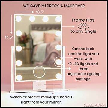 REBEL POPPY Vanity Mirrors with LED Lights - Phone Mount, 3 Lighting Touch Control, 18.5” x 14.8”, Fogless - Hollywood Lighted Makeup Mirror (White)
